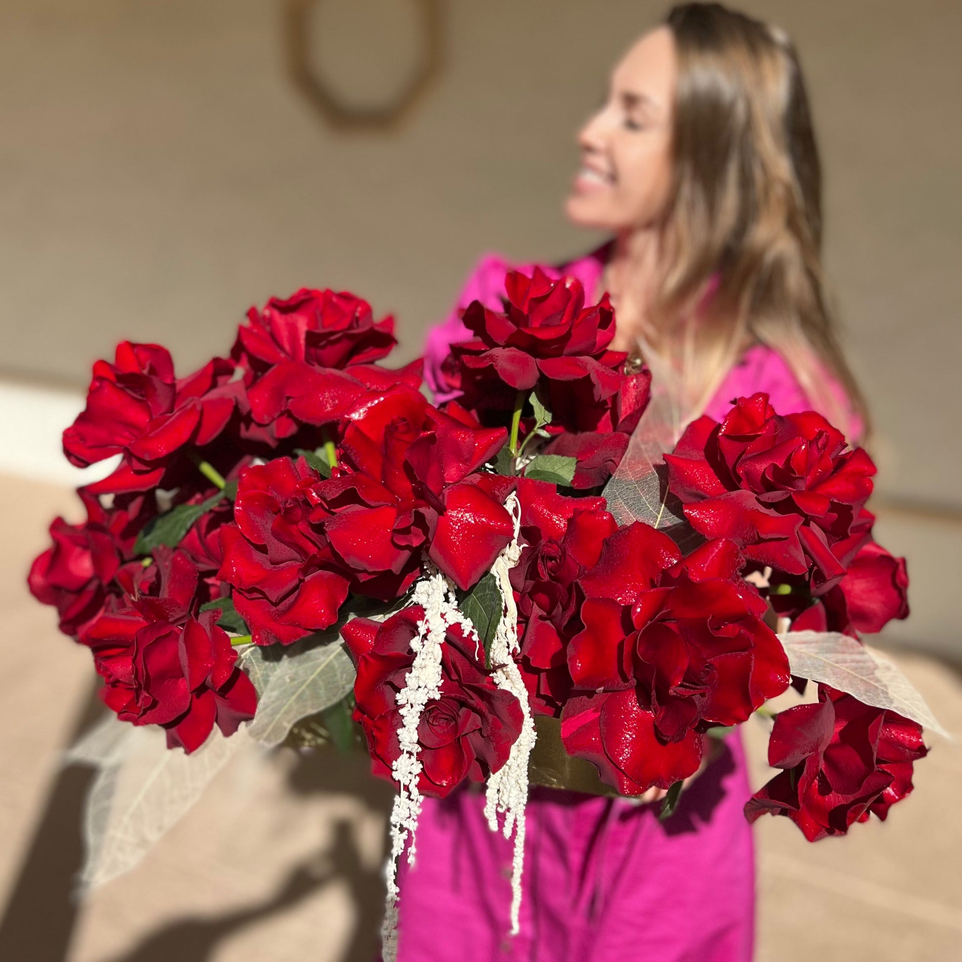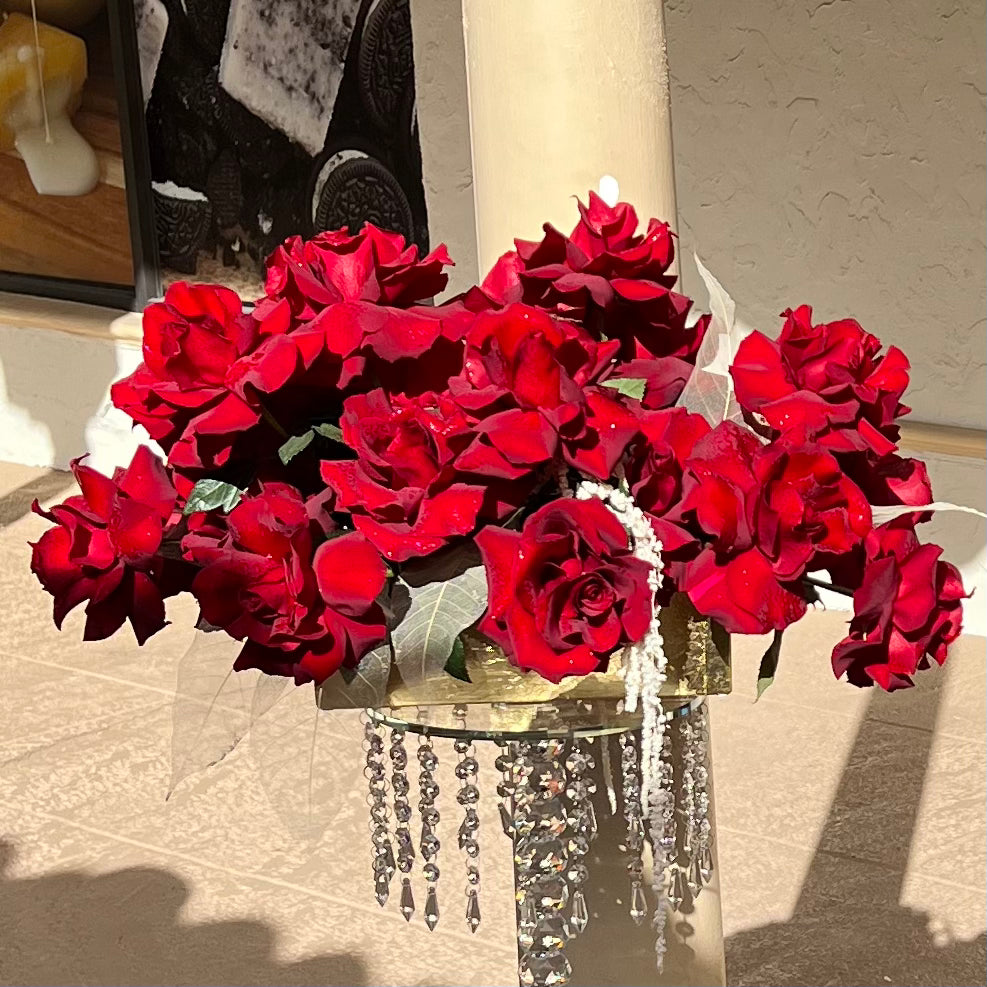 Red roses have long been associated with love and passion. And while there are many different colors of roses, each with their unique meaning. This simply beautiful vase a symbol of new passion and eternal love or if you want to order thank you for hospitality flowers to your closed ones.