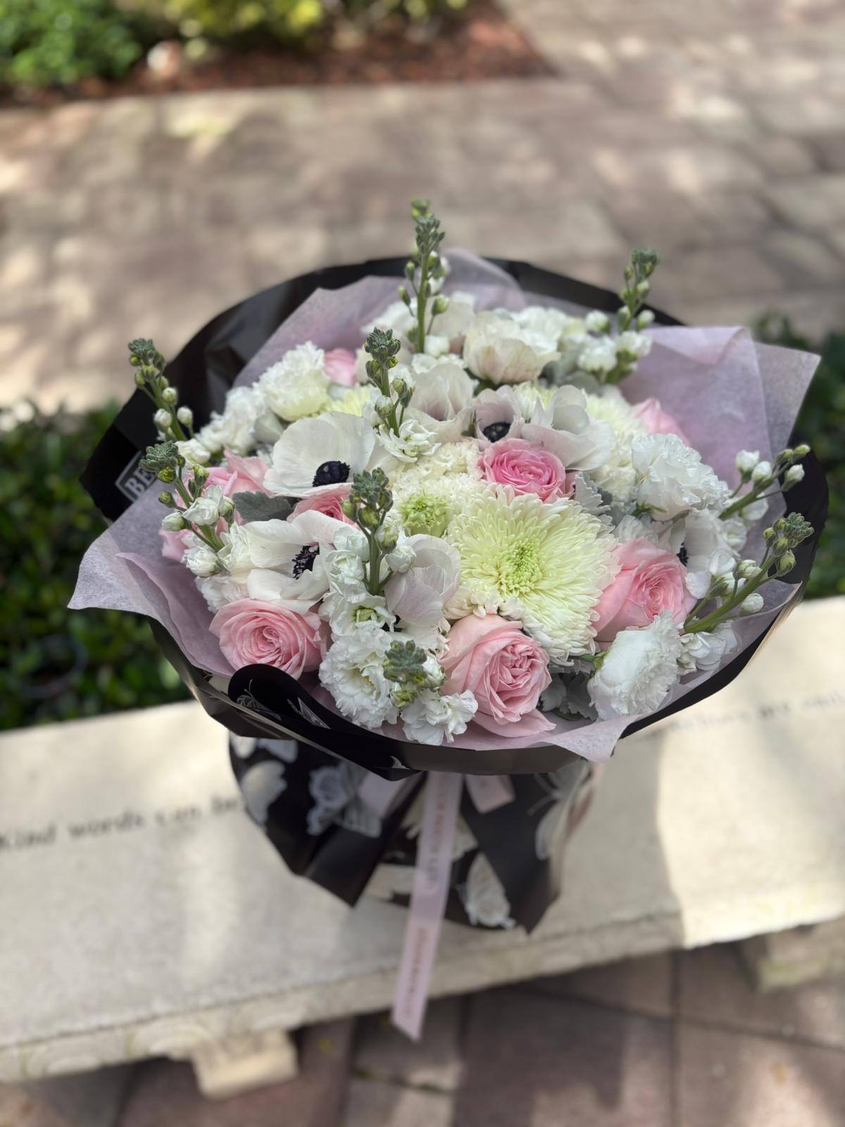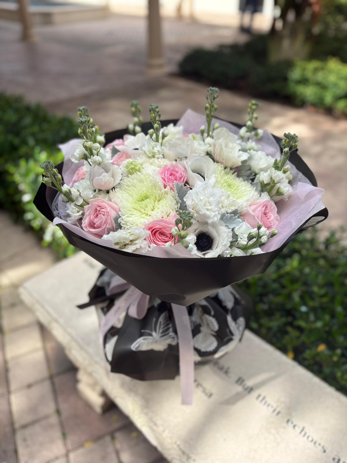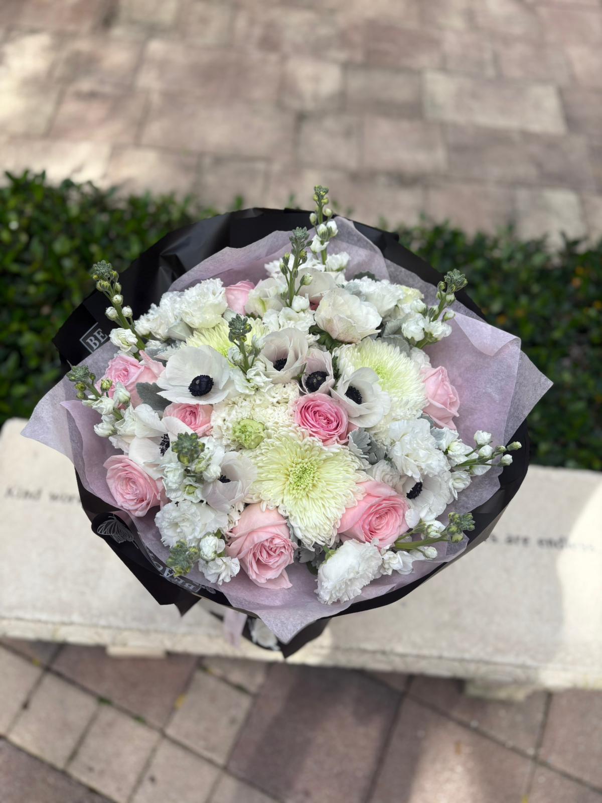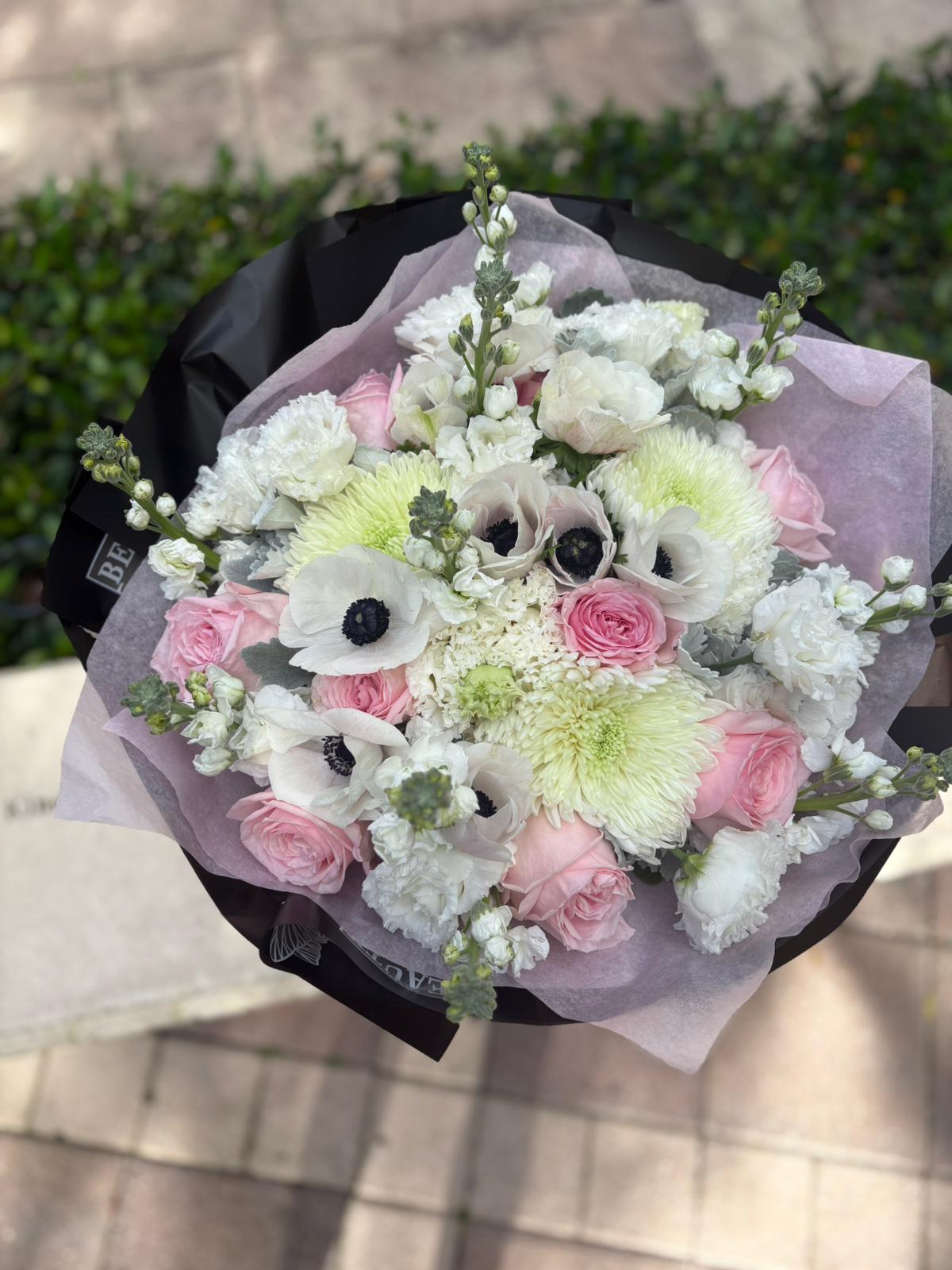 It is a timeless, classy, and the most romantic way of expressing your love. You can never go wrong with a fresh bouquet of self-delivered roses. This iconic bouquet of pink roses, anemones, big white football mums and stock in blush tones, wrapped in chic paper was designed to bring a touch of magic winter to any space.