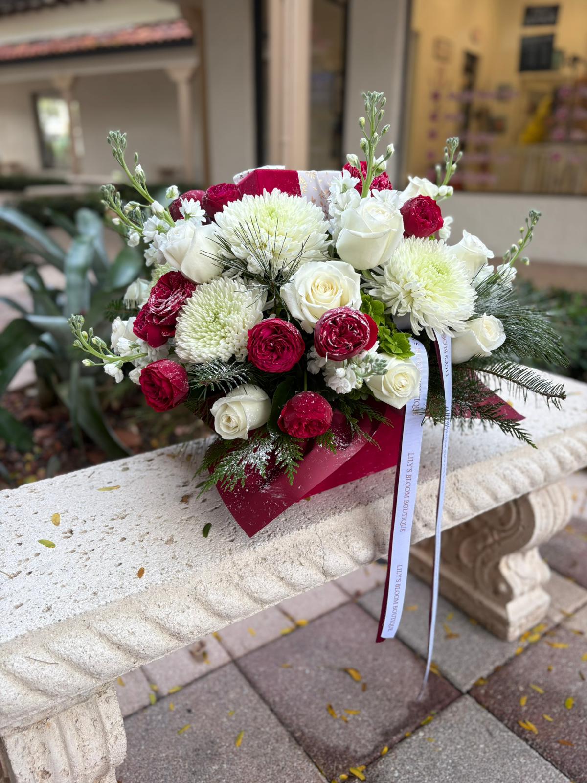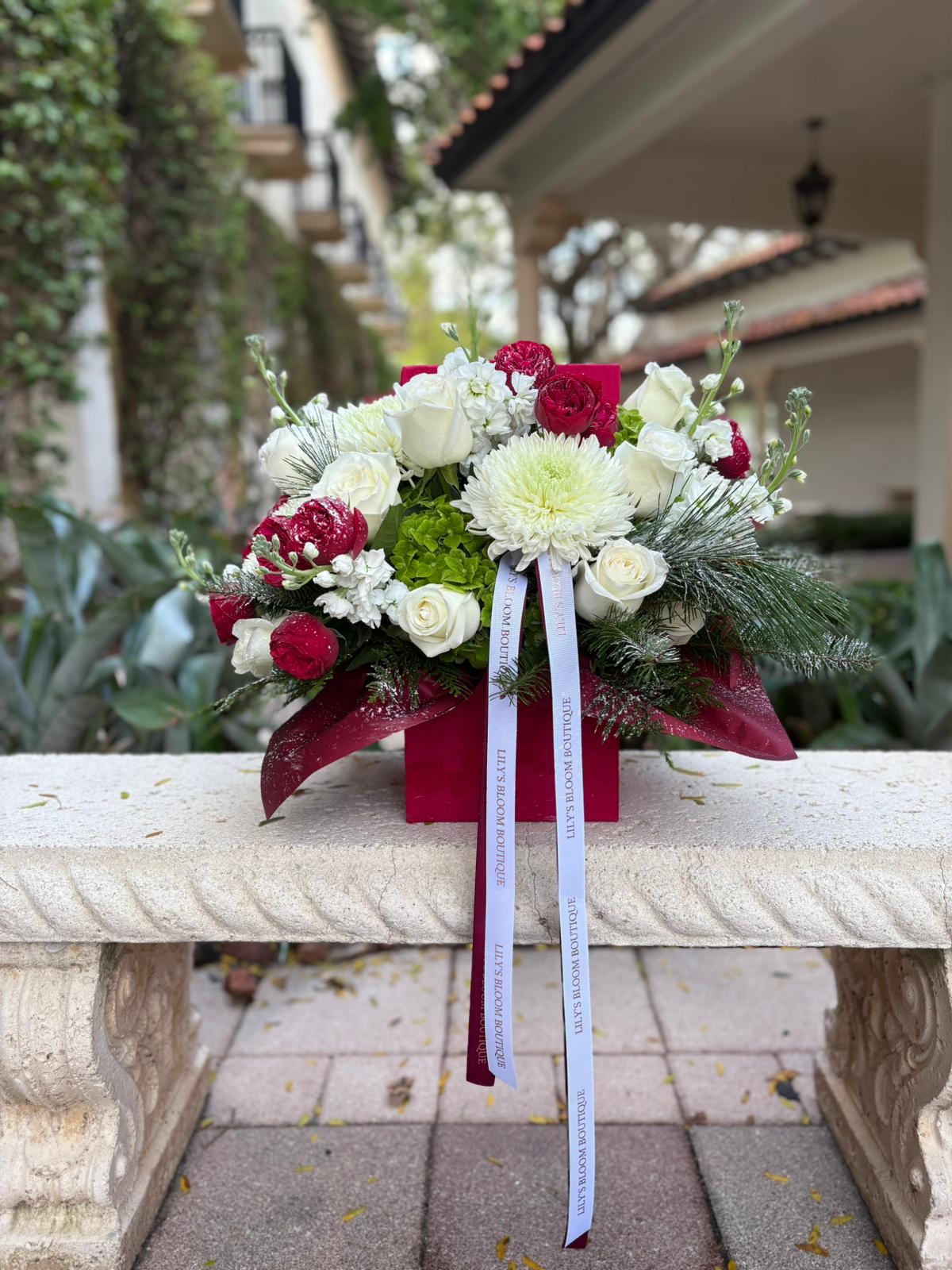 This time of the year! Beautiful Christmas Mix of Premium White and Red Roses with a delicate touch of green designated in a Red Velvet Christmas Box.