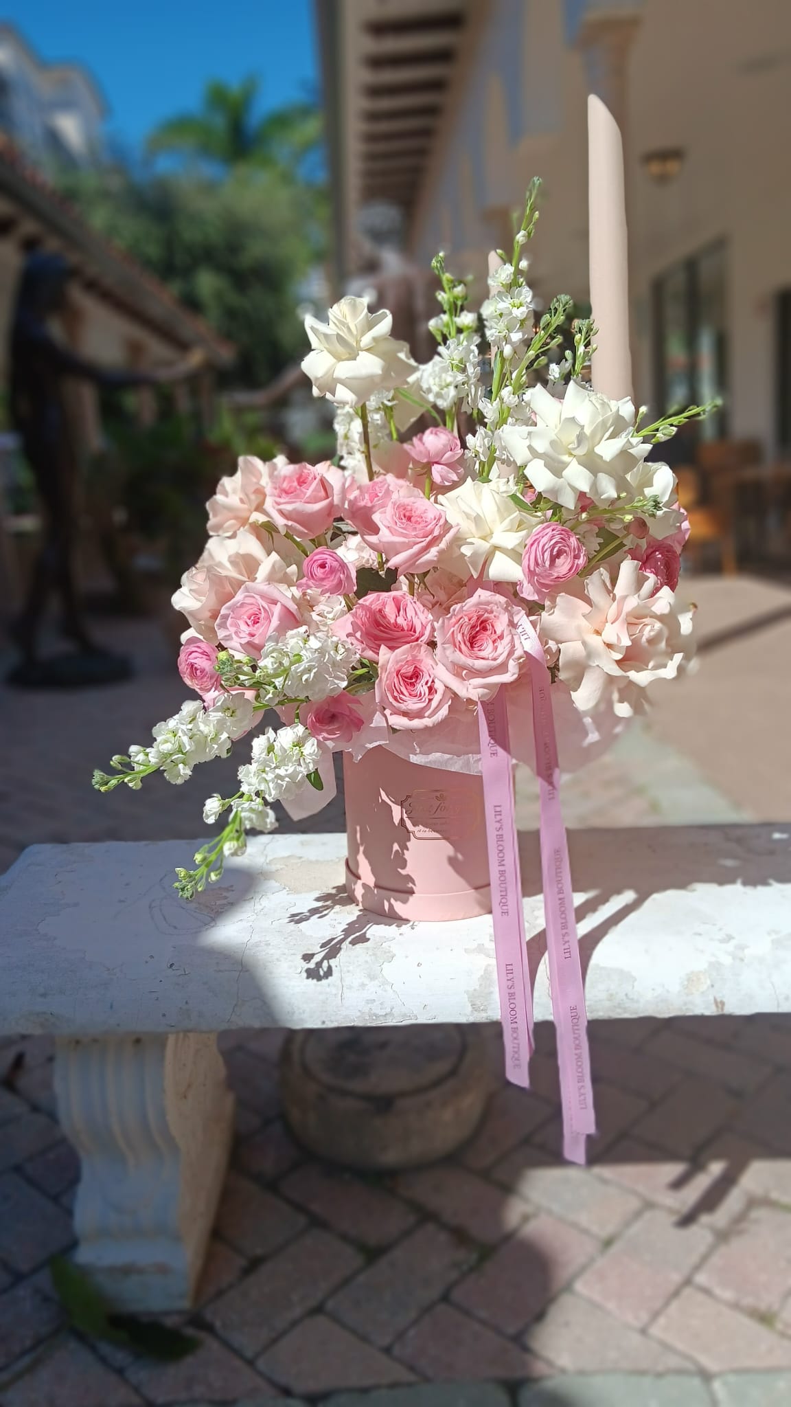 This beautiful arrangement features white and light pink roses arranged in a circular shape. To add a touch of whimsy, we've added some greenery and set the flowers to look like a bunch of happy thoughts. Here's what makes the Dewy Dreams a perfect box :