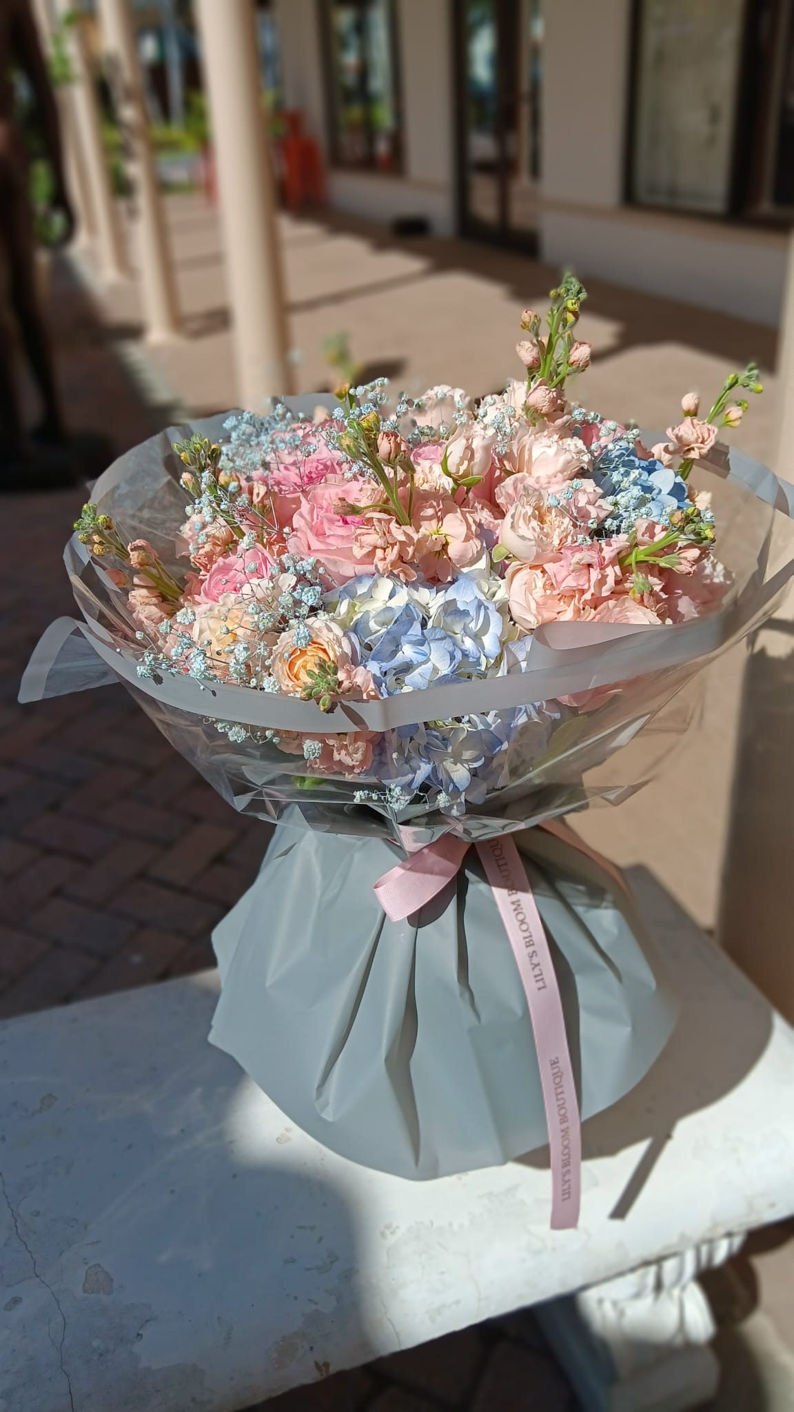 Each bouquet is carefully arranged to ensure it arrives fresh and beautiful. With its graceful design, this Pink and Blue bouquet will help you say, "Thank you."