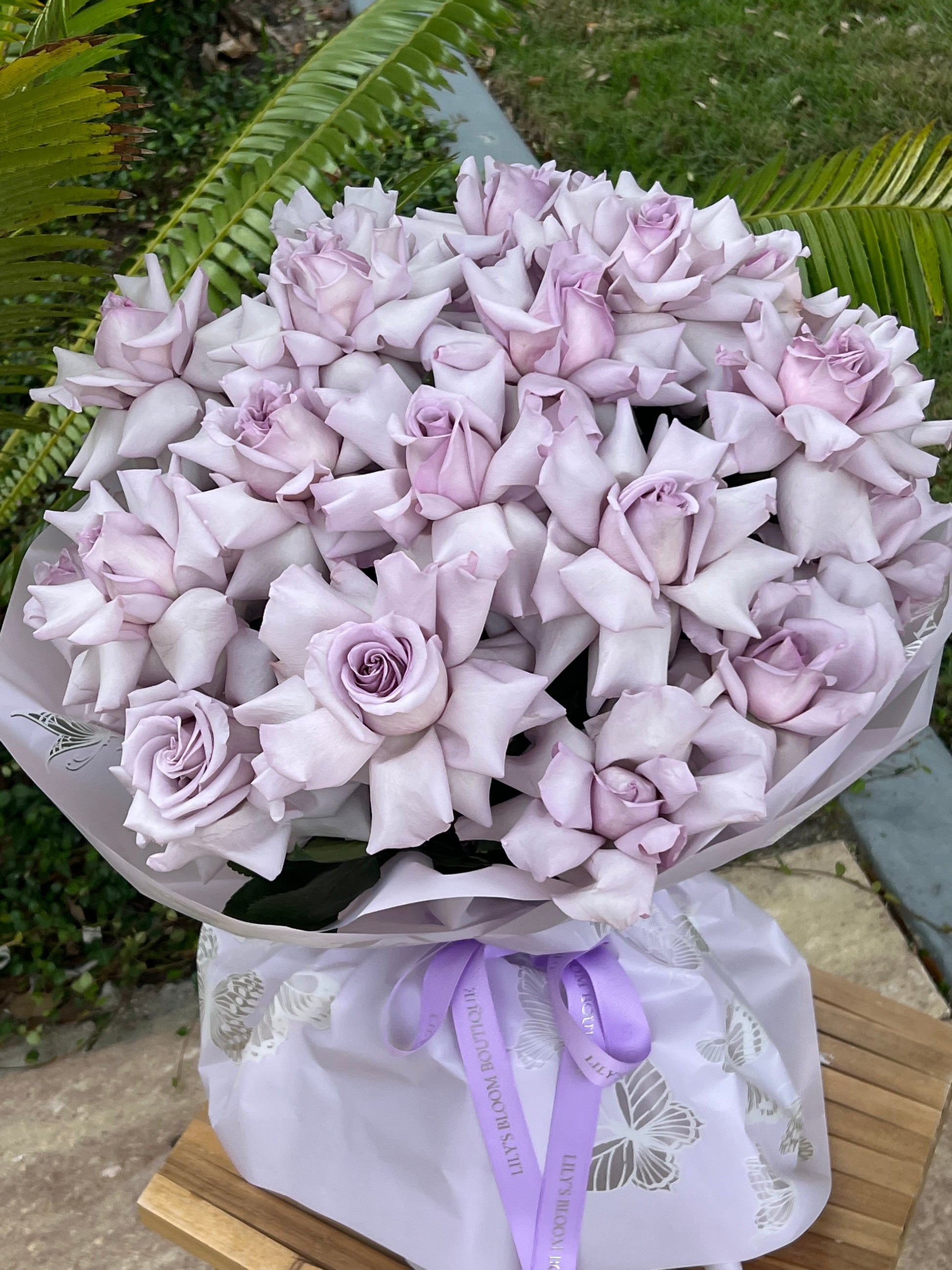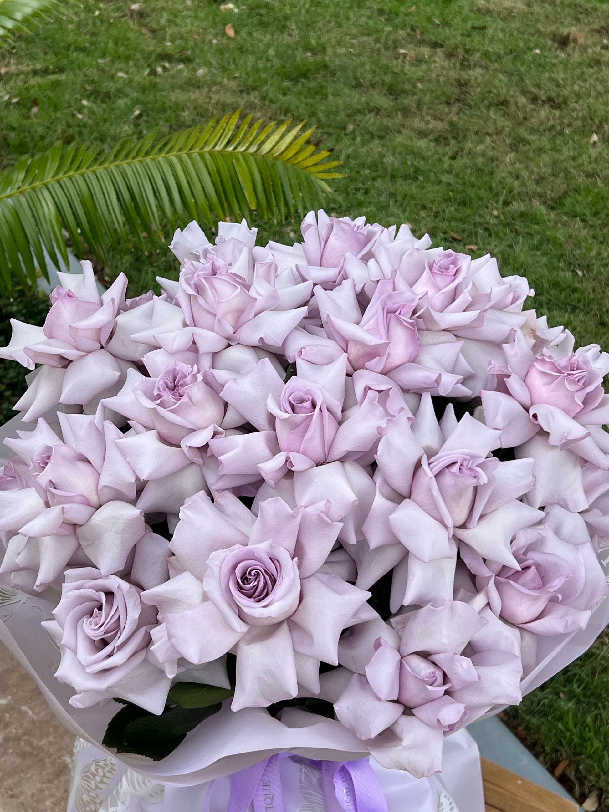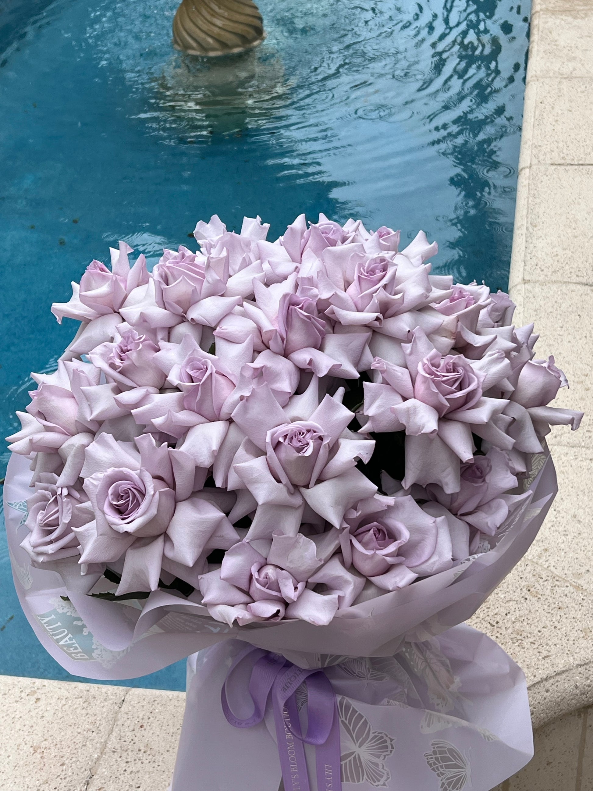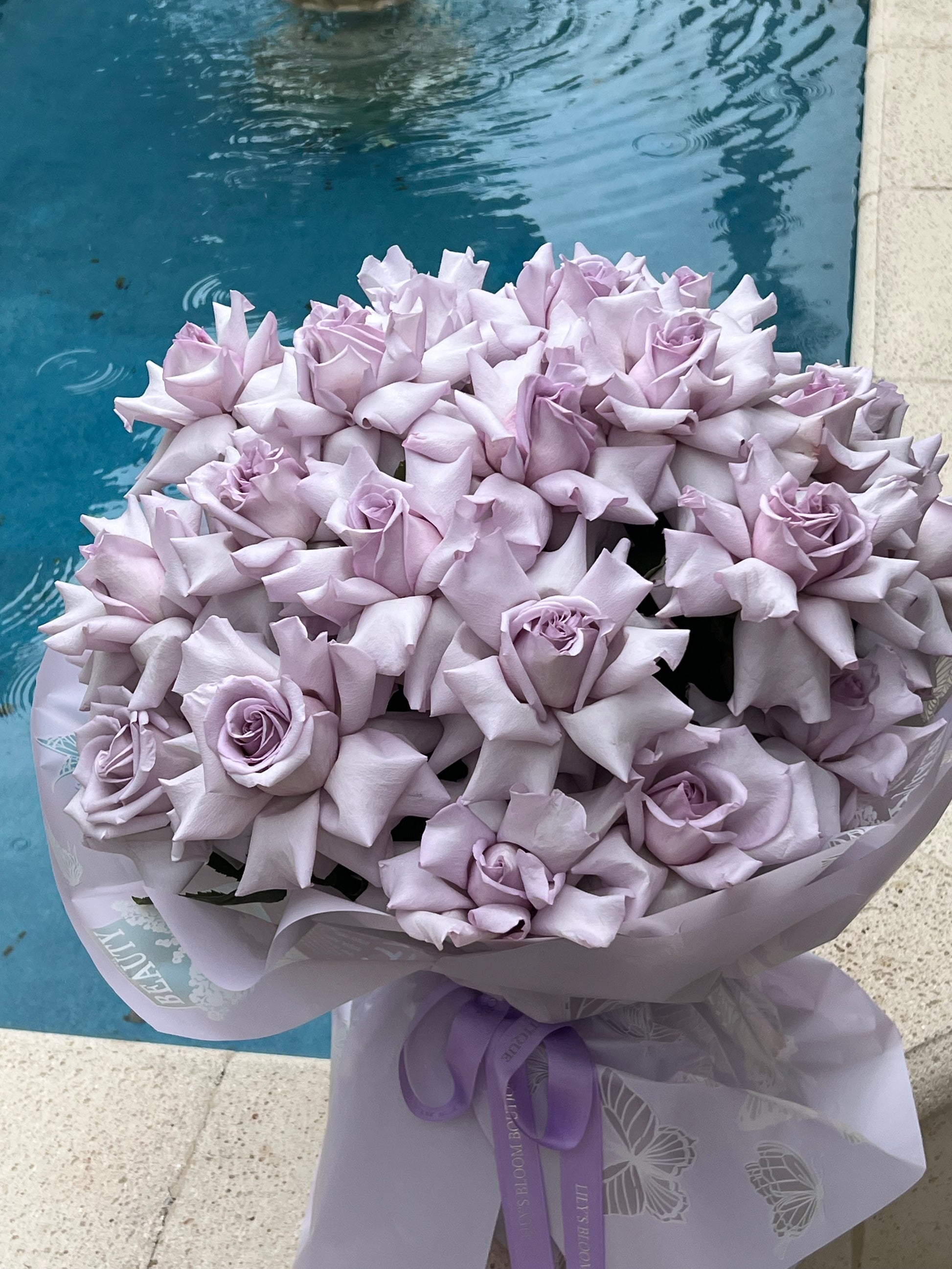 Dive into a visual spectacle as the stunning purple roses, fragrant and radiant, have their petals tenderly opened by hand to ensure the perfect bloom. Paired with the delicate elegance of mantiola flowers, this bouquet presents an entrancing dance of colors and fragrances, making every moment unforgettable. Ideal for those who appreciate the artistry of nature.