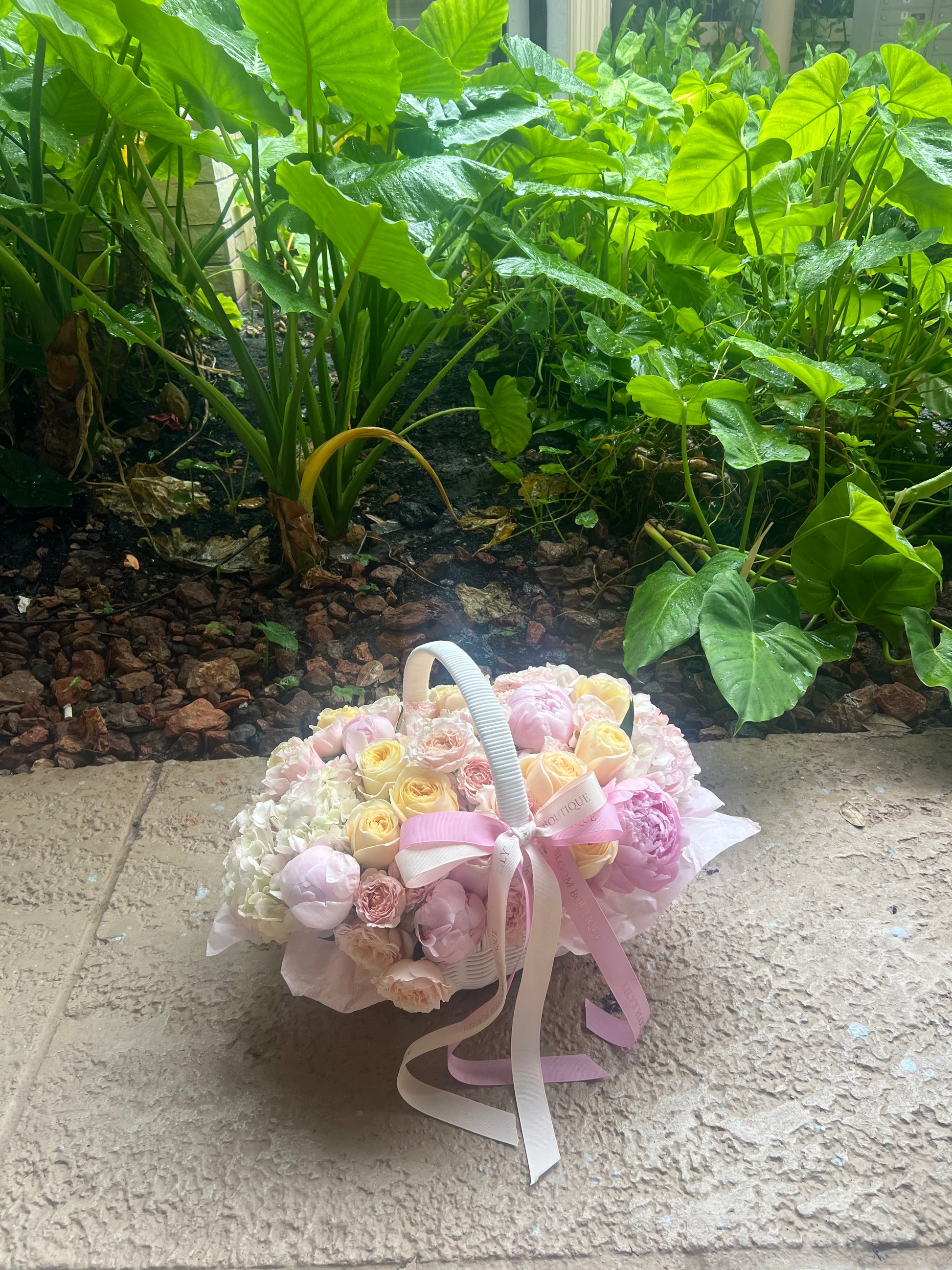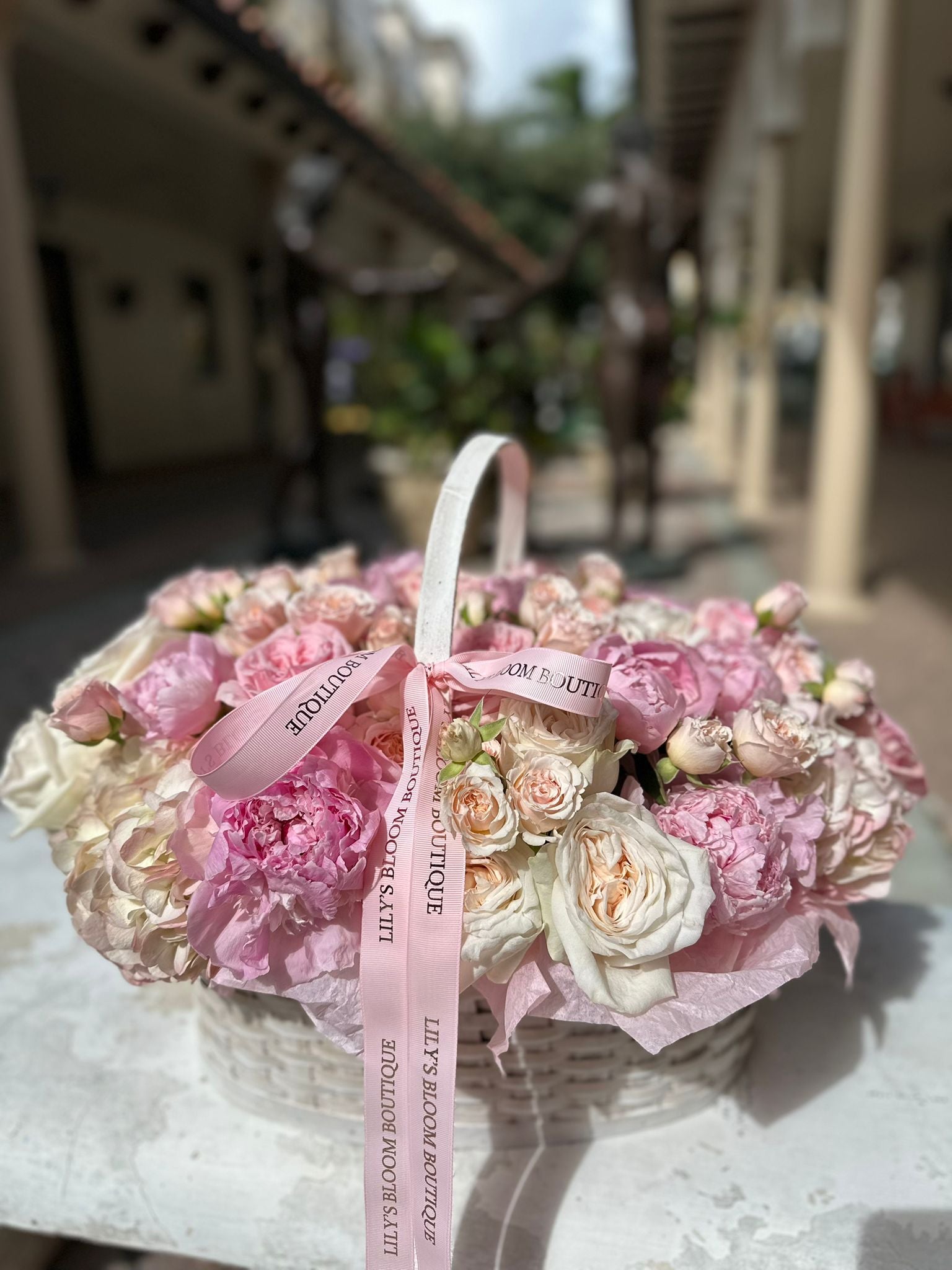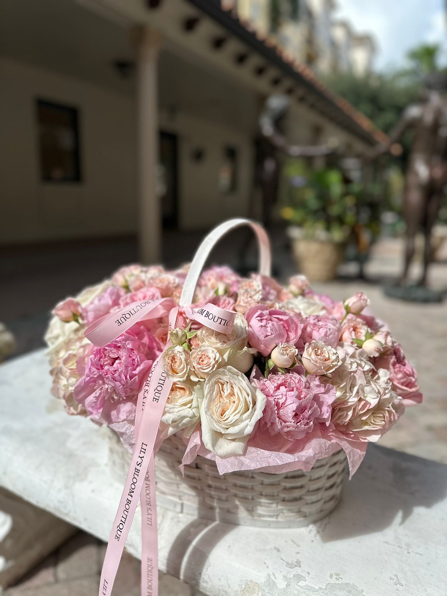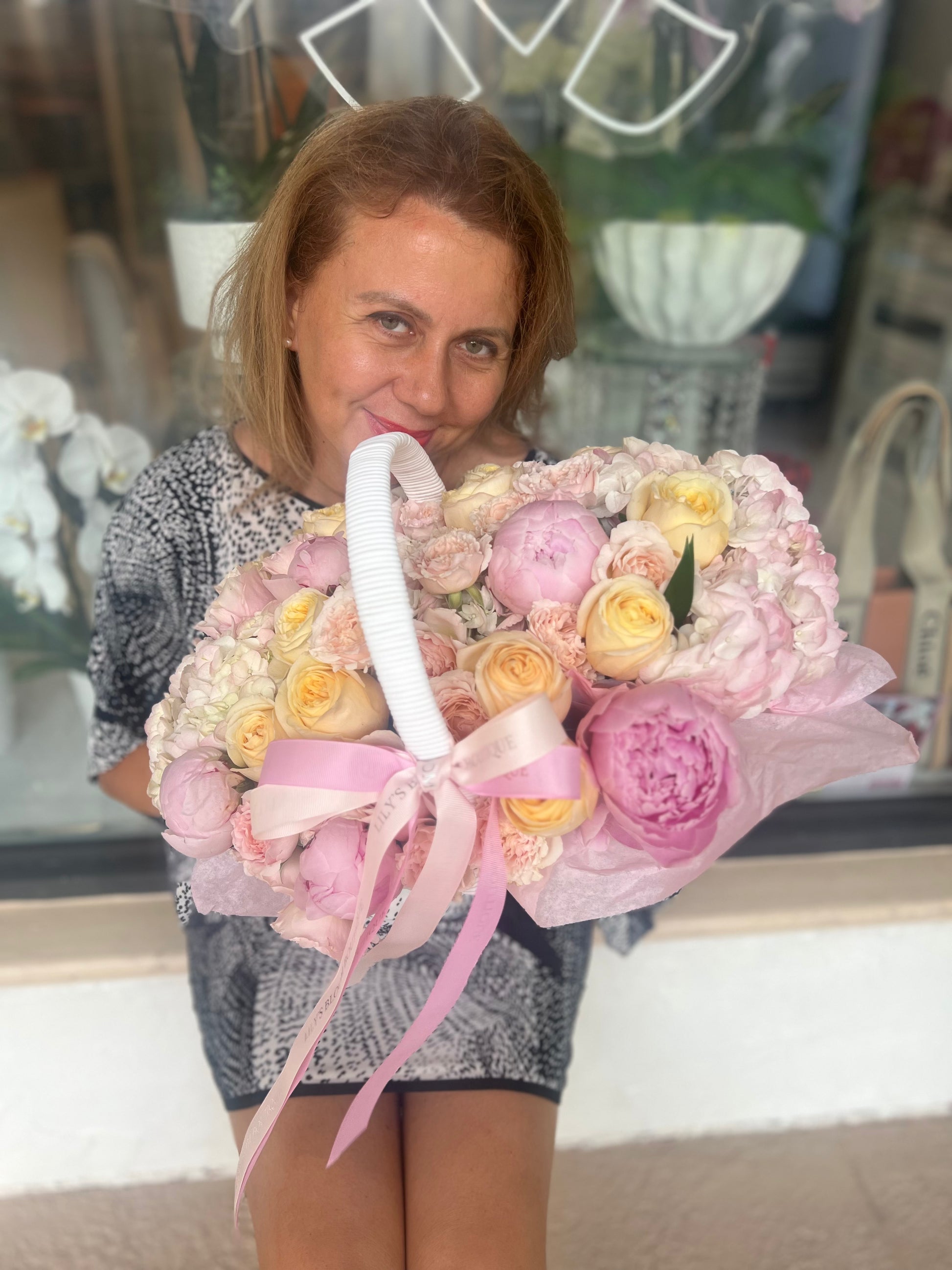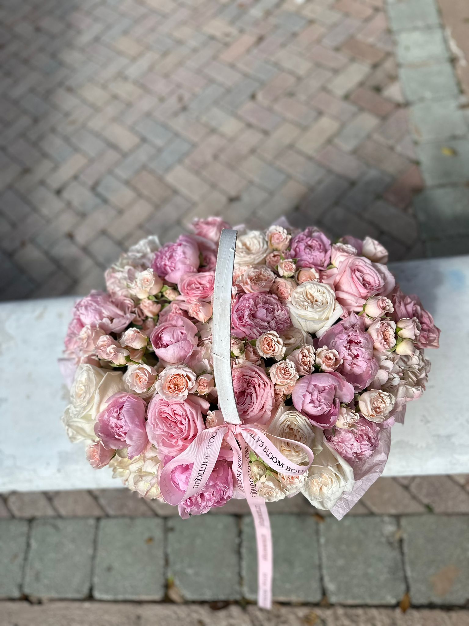 A soft pink touch of peonies and roses in a basket !