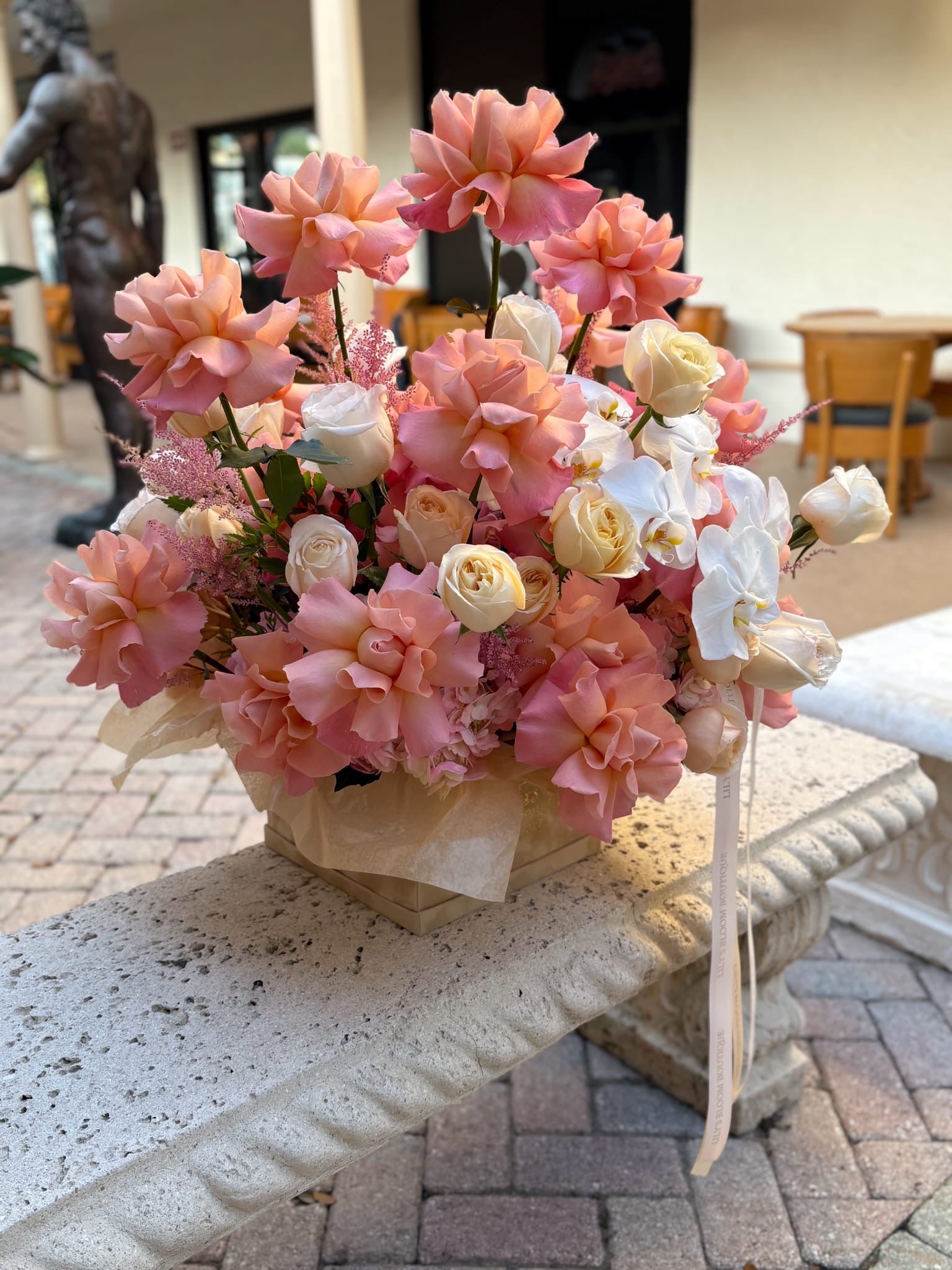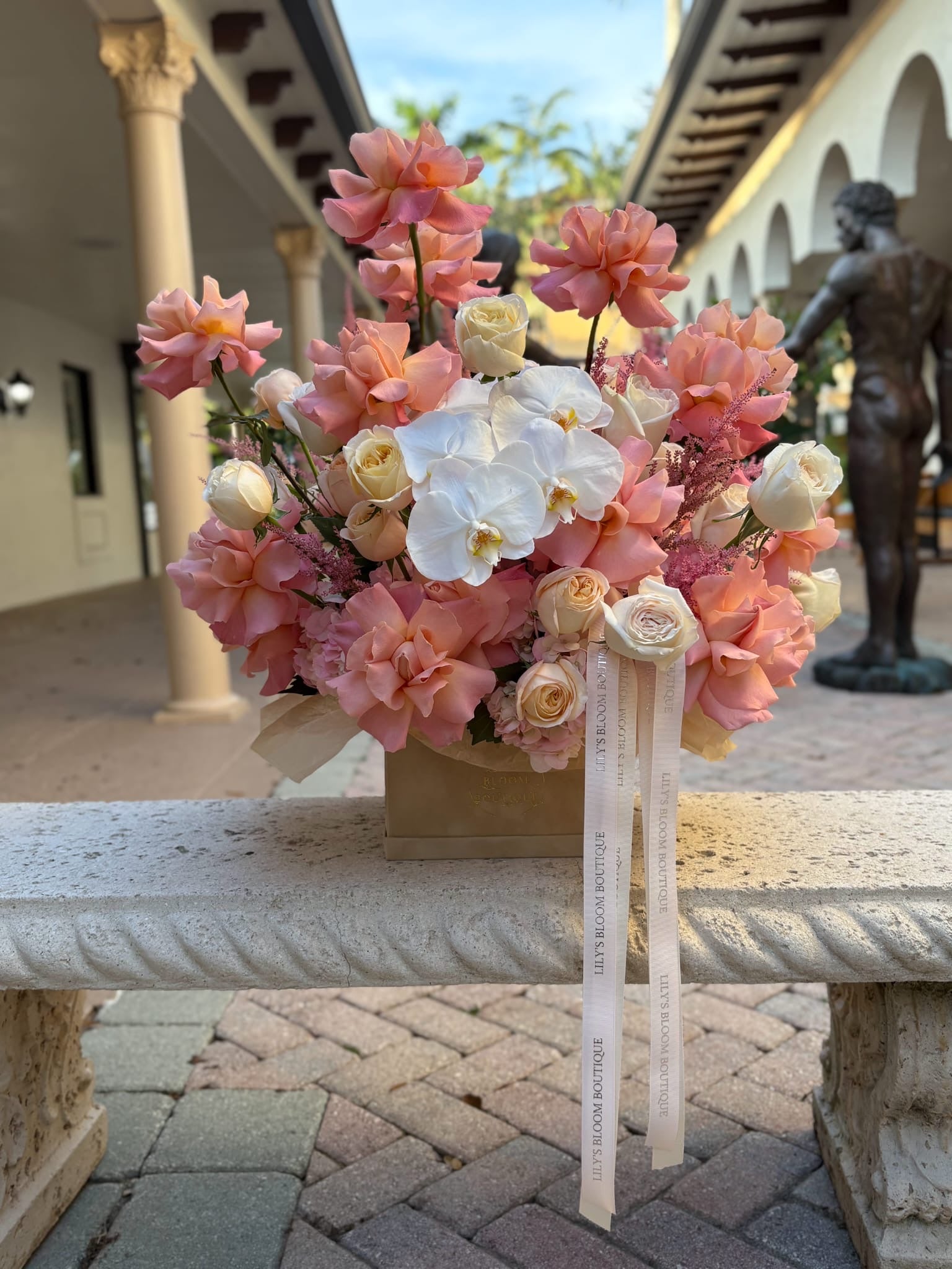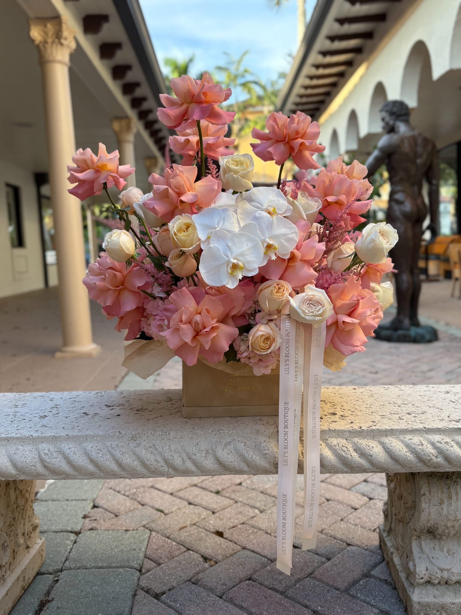 Our orchids with roses box flowers is a beautiful arrangement of pink roses in different shades with beutiful orchids. It is adorned with a bit of greenery, making it a charming box arrangement that is perfect for any occasion. These flowers sweet fragrance and bright colors are truly magical.
